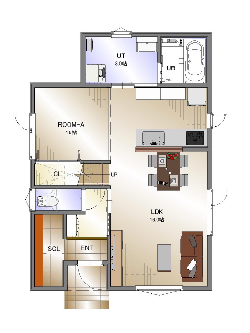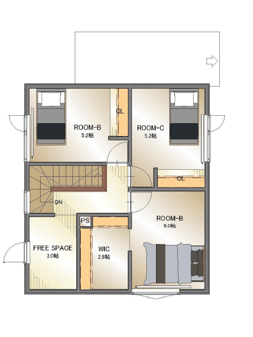 30C FLOOR PLAN 1F 2F 1F 床面積 53.2㎡ (16坪) 2F 床面積 46.3㎡ (14坪) 延床面積 99.5㎡ (30坪) 建築面積 54.6㎡ (16.5坪) EXTERIOR